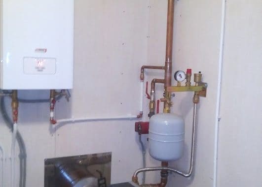 Состоит она из твёрдотопливного котла Viadrus и электрического котла Protherm Скат. Такая схема из двух котлов удобна и надёжна: в дневное время отопление происходит дровами или углём, а в ночное время подключается электрокотёл и поддерживает комфортную температуру.