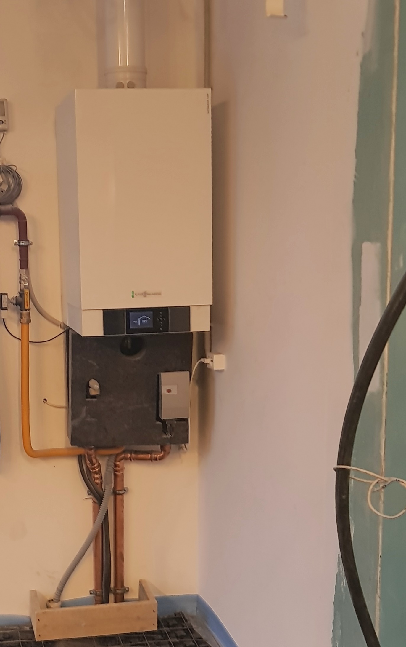 Котёл мощностью 24 кВт установлен в деревянном доме. LAS-дымоход с системой антиобледенения выведен через стену.